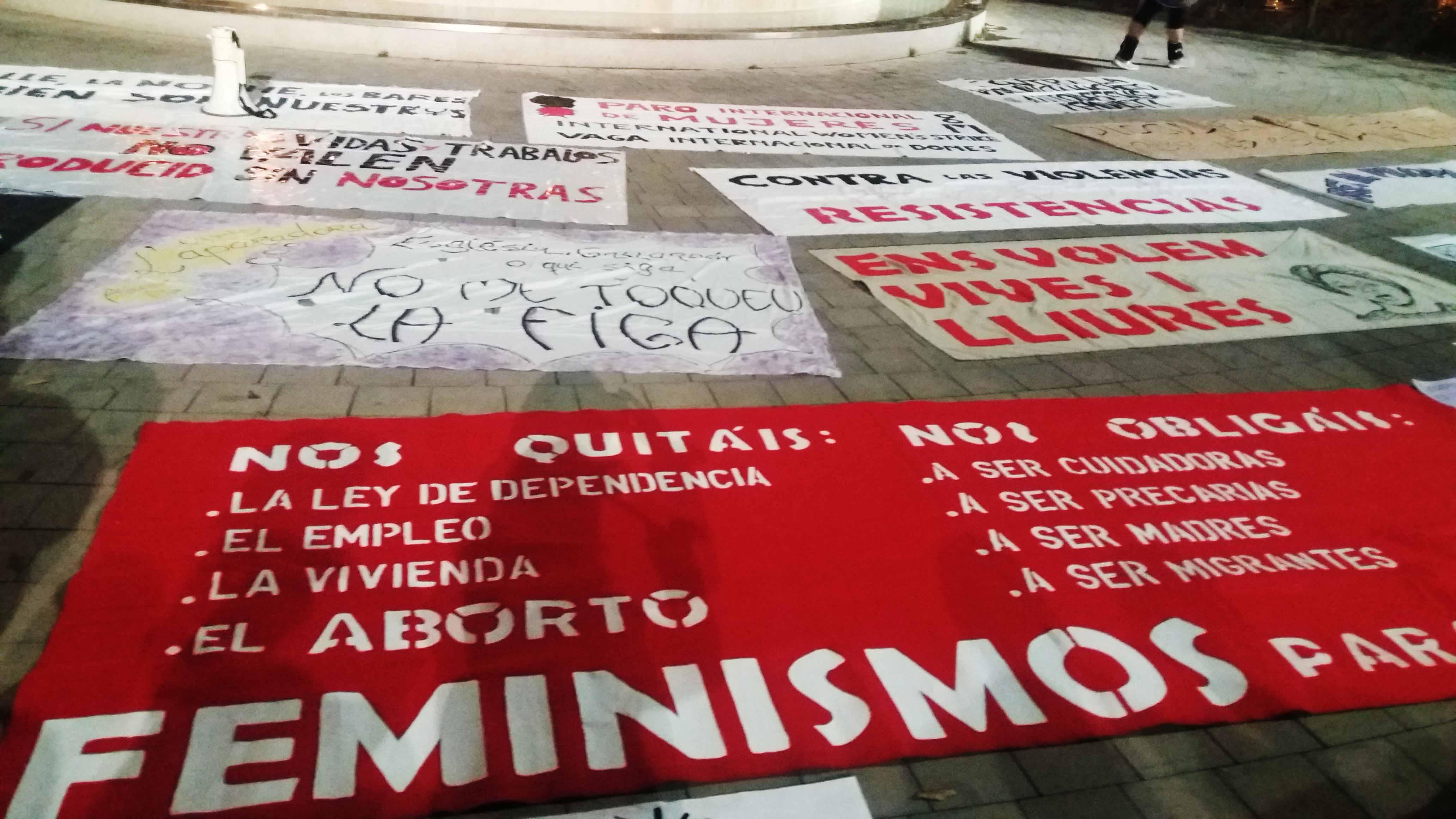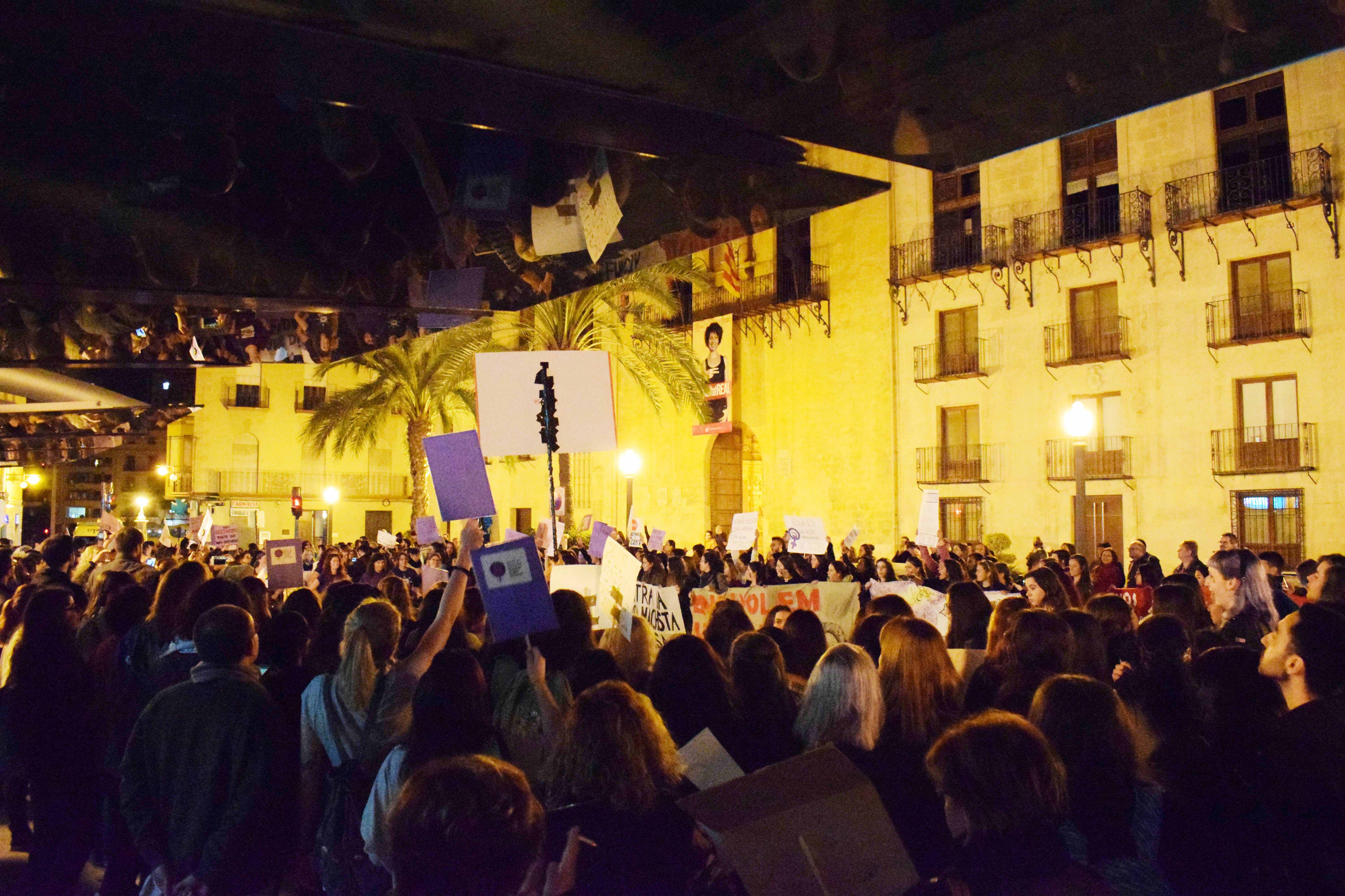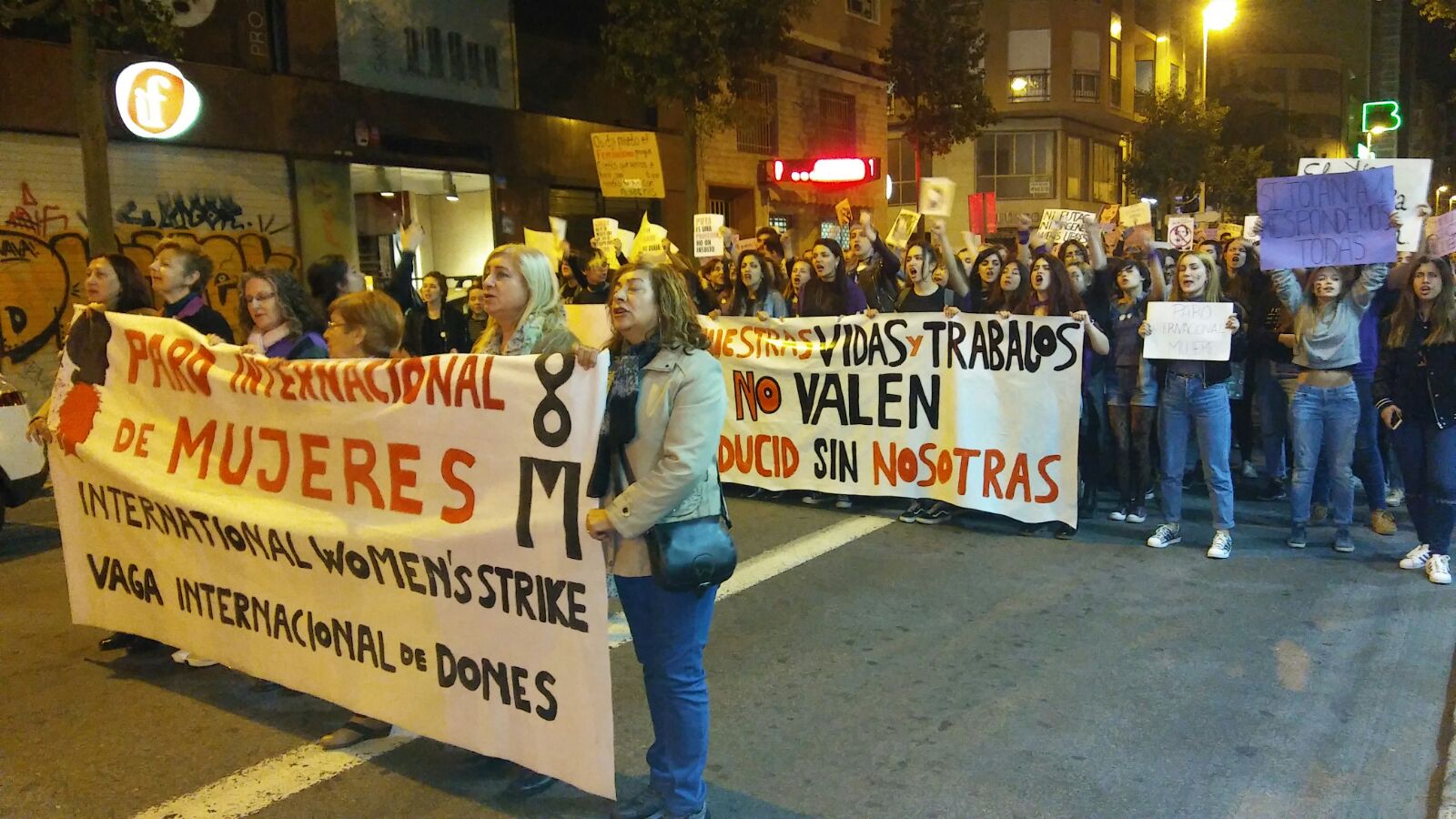 Centenares de mujeres recorrieron las calles de Elche portando pancartas, en las que se podían leer “SI NUESTRAS VIDAS Y TRABAJOS NO VALEN, PRODUCID SIN NOSOTRAS” o “TODA MUJER TIENE DERECHO A SER ELLA MISMA Y A HACER LO QUE ELLA QUIERA”