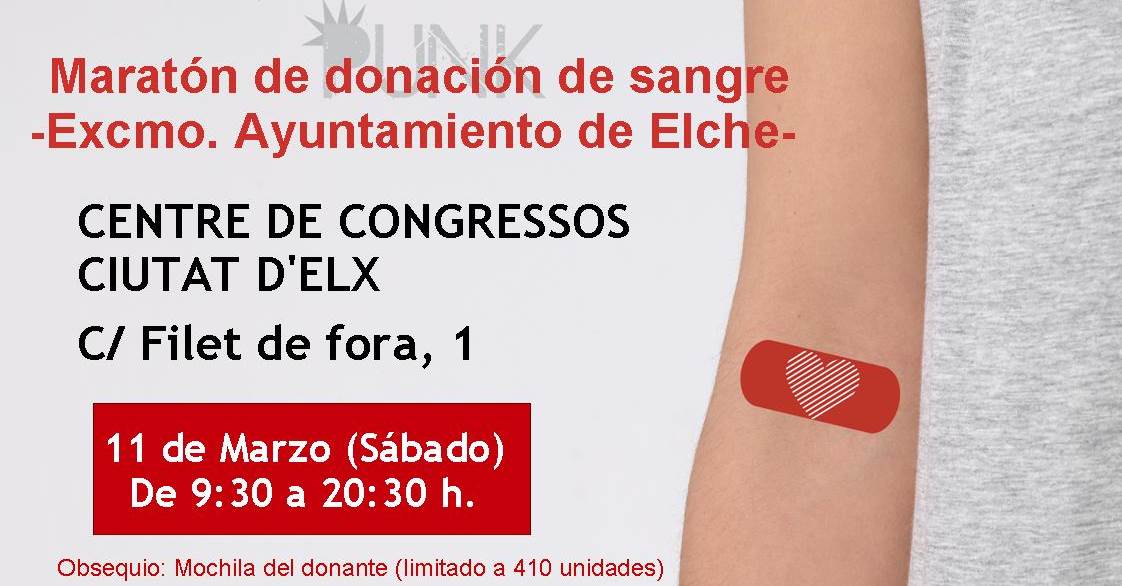 El Centro de Transfusión junto al Excmo. Ayuntamiento de Elche, realizará el próximo día 11 de marzo (09:30 a 20:30h) el Maratón de Donación de Sangre Ciutat d’Elx en las instalaciones del Centro de Congresos de la ciudad, donde se espera que acudan más de 400 personas.